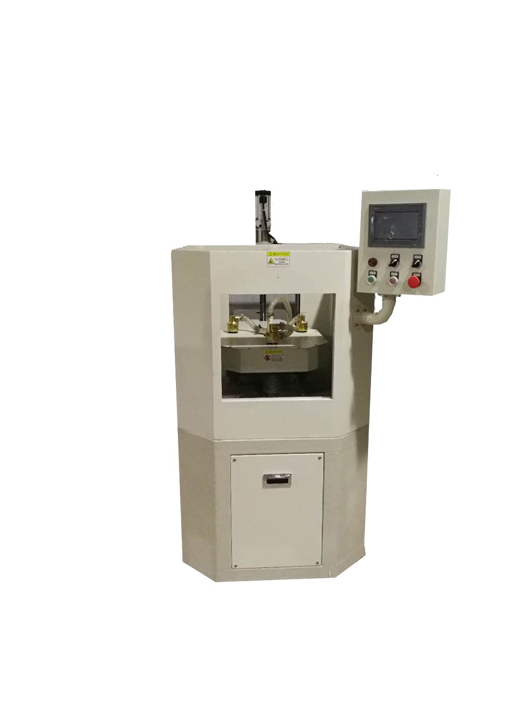 工作過程:經過防水處理的手機放在下盤,通過固定大小的卡槽固定。設定好參數后啟動,上下盤以相反的方向轉動,并且上盤向下運動,機器進入計時狀態,達到設定正轉時間后,上盤上升一段距離,然后上下盤反向轉動,進入反轉時間,打磨樣品,反轉時間結束后,一輪打磨過程結束。